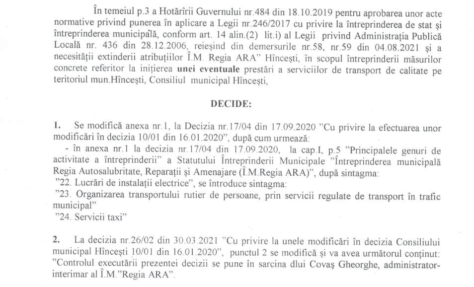 Potrivit deciziei nr. 32/06 din 06.08.2021, consilul municipal Hîncești a decis modificarea unei decizii și sintagme de extinderea atribuțiilor. Astfel s-a decis să fie inclusă sintagma “Organizarea Transportului Rutier de persoane prin servicii regulate de transport în trafic municipal”. Cât și servicii de taxi.